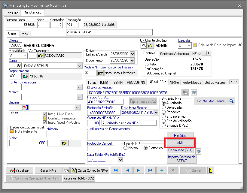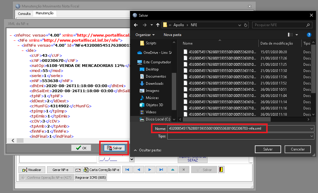 4 - Clique no botão XML e salve o mesmo no diretório de armazenamento das notas emitidas.