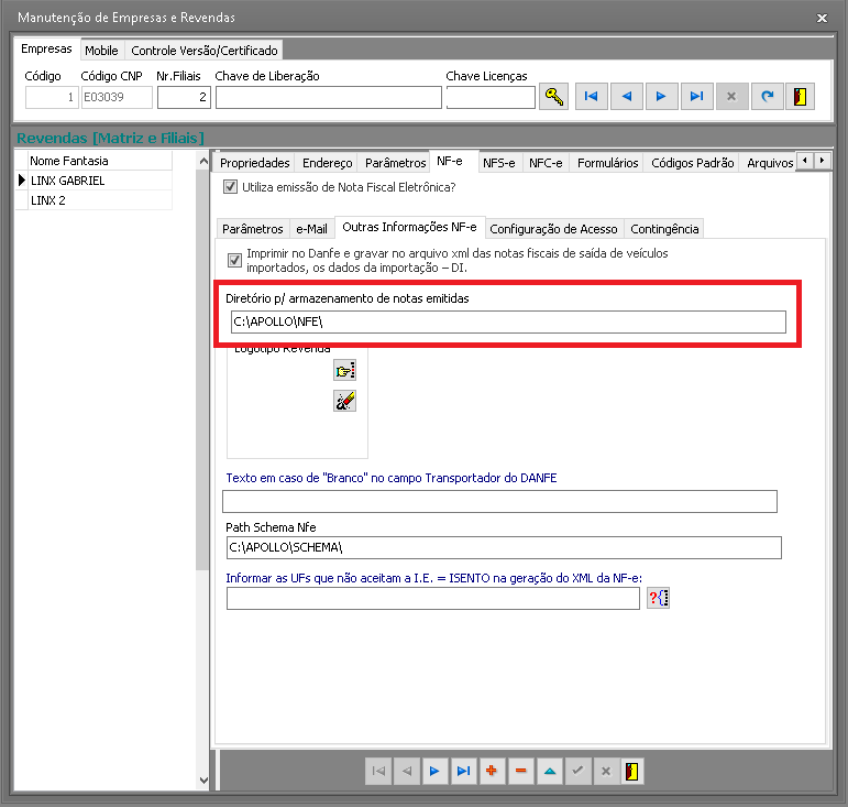 1 - Verifique o diretório de armazenamento das notas emitidas no menu Configuração - Cadastros - Empresas e Revendas, aba NF-e, subaba Outras Informações NF-e, campo Diretório p/ armazenamento de notas emitidas.