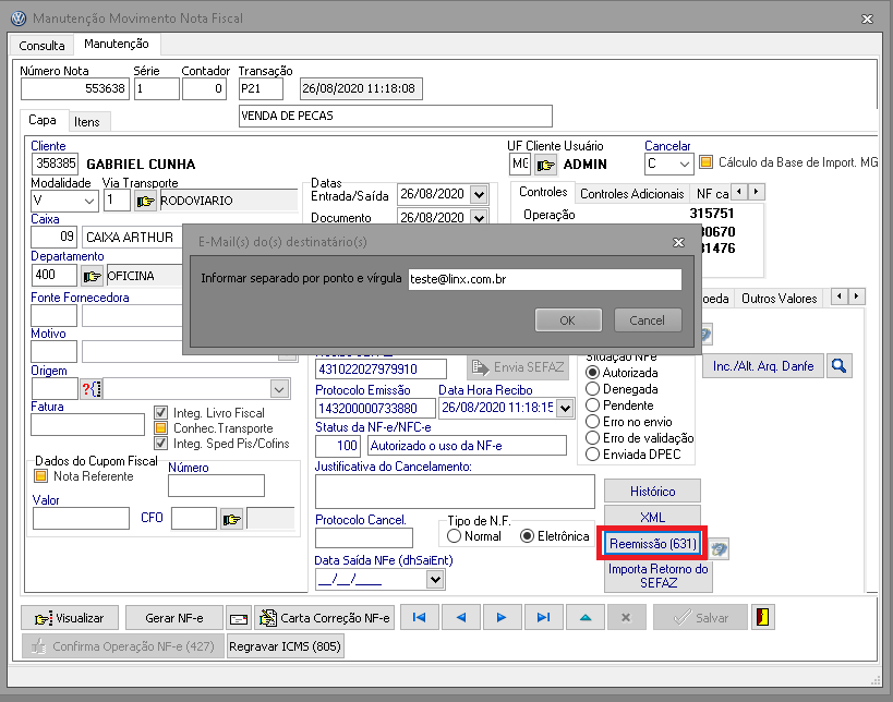 6 - Após salvar o XML no diretório o DANFE deve ser enviado por e-mail corretamente.