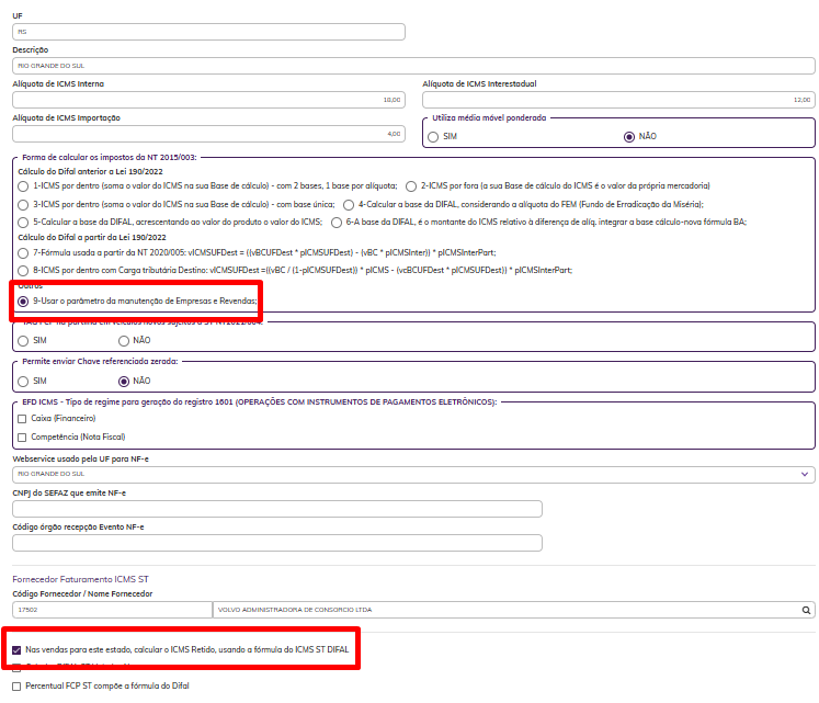 2) Acesse o menu Configuração > Cadastros > Estados e verifique qual a fórmula de cálculo dos impostos da NT 2015/003 e se está marcado "Nas vendas para este estado, calcular o ICMS Retido, usando a fórmula do ICMS ST DIFAL".