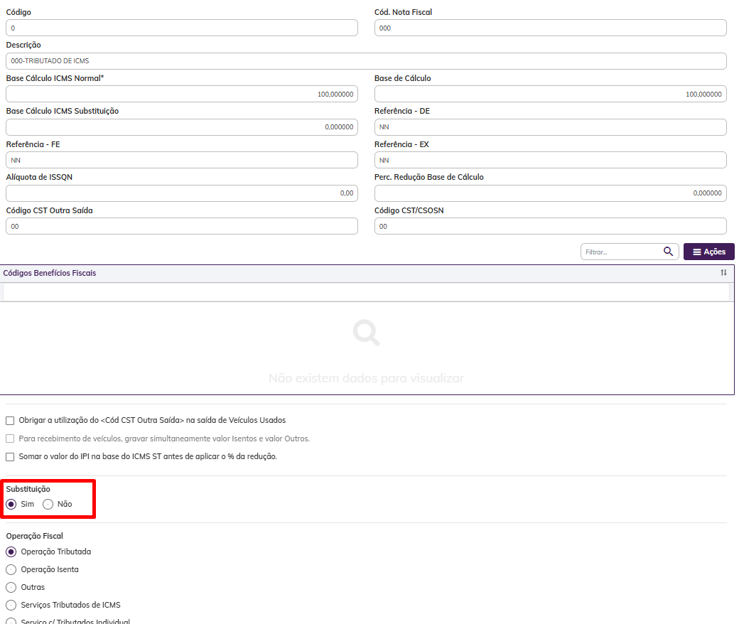 5) Em Configuração > Cadastros > Código de Tributação a opção "Substituição" deve estar marcada como "Sim".