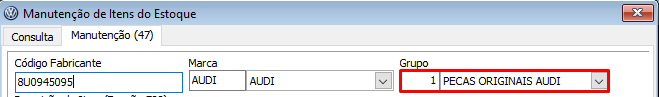 - Acessar o cadastro do Grupo do ItemO grupo do Item pode ser localizado no seguinte campo:Acessar o menu: Peças > Cadastros > Grupo de Itens