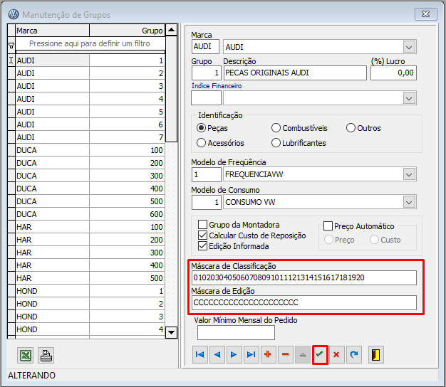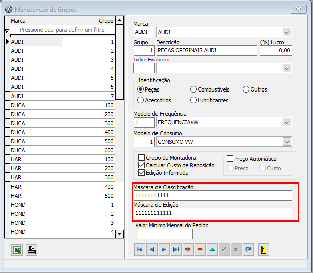 O campo "Máscara de Edição" serve para dividir os códigos do fabricante com caracteres como "barra" e "traço".