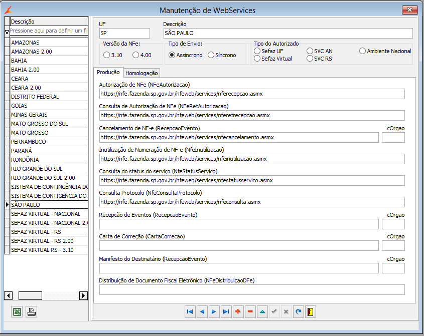 Após identificar isso, devemos acessar o caminho Configuração > Cadastros > Manutenção de Webservice e criar um cadastro de webservice referente a São Paulo, acessar a página da SEFAZ onde estão os webservices e atualizar os campos.