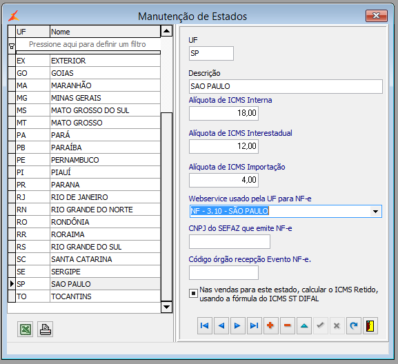 Feito isto, acesse o caminho Configuração > Cadastros > Estados, procure pelo estado referente a nota, que no nosso exemplo é São Paulo e informe o webservice que cadastramos novamente.