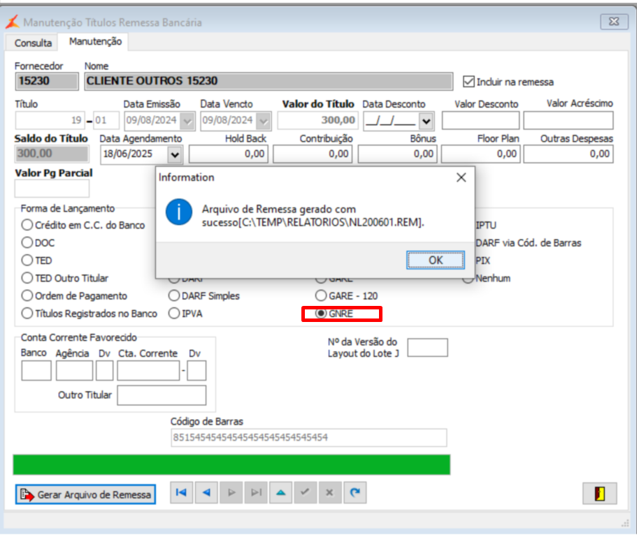 Gerar o arquivo de Remessa Bancária com o segmento 'O' quando se tratar de um pagamento do tipo tributos 'GNRE'.