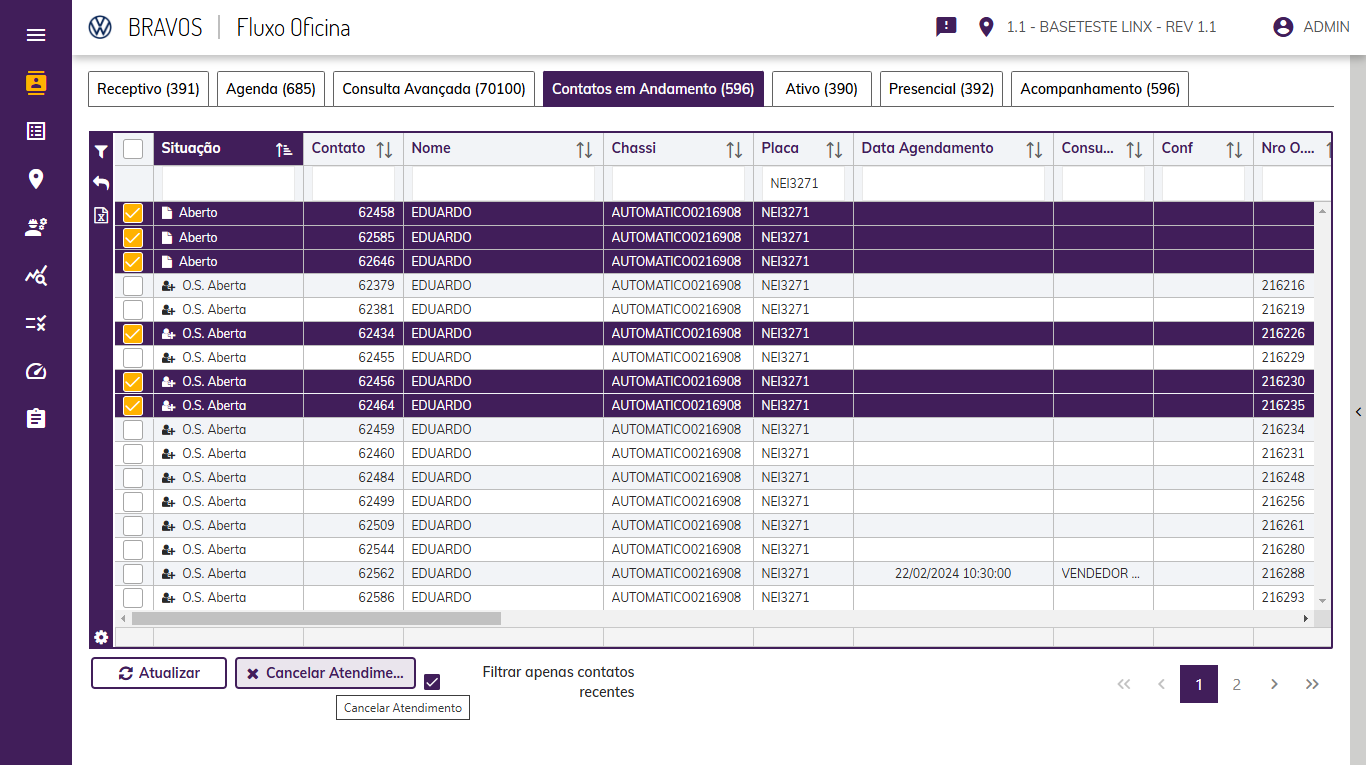 Todos os contatos passíveis de cancelamento (que não possuem O.S. aberta, nem peça reservada) serão cancelados automaticamente. E assim, teremos apenas os contatos que realmente interessam manter em andamento no sistema.