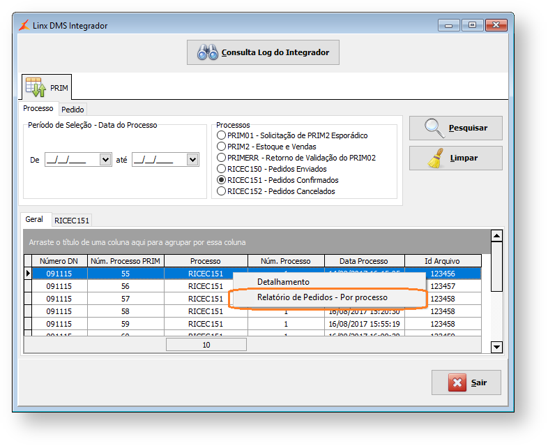 Figura 28: Consulta dos processos do Integrador – Opção Relatório