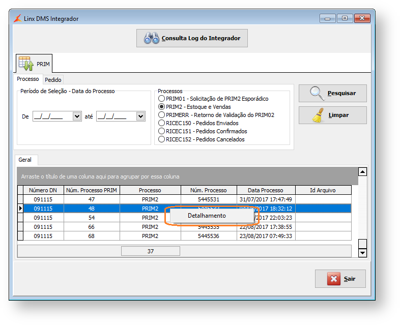 Figura 26: Consulta dos processos do Integrador – Opção Detalhamento
