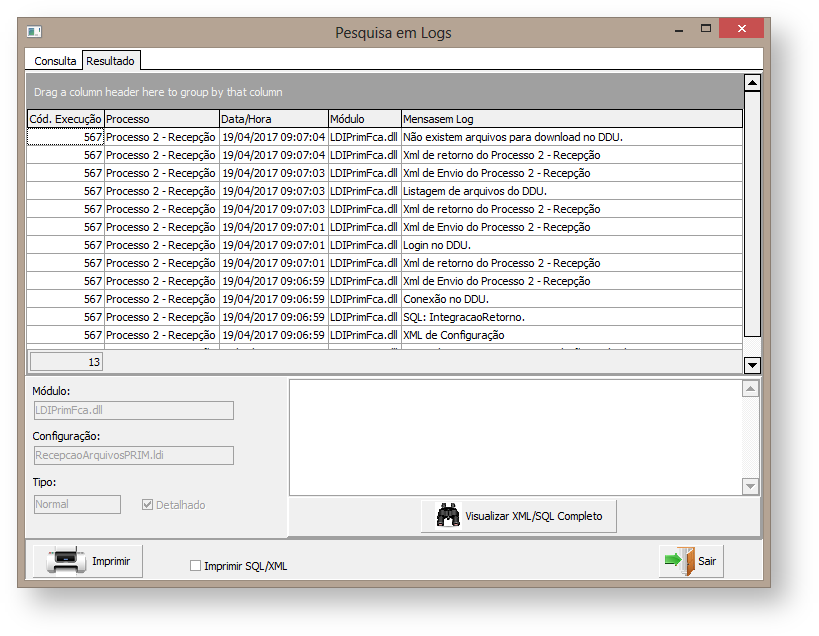 A coluna "Tipo" apresenta o tipo do log gravado. Os tipos "XML" e "SQL" permitem uma consulta detalhada do arquivo ou comando respectivamente.