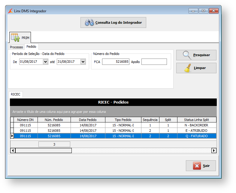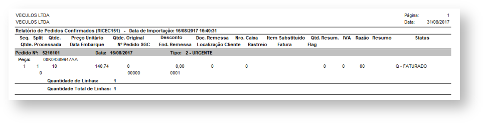 FCA para o DMS | RICEC150 | Informações sobre linhas de pedido devidamente enviadas. |