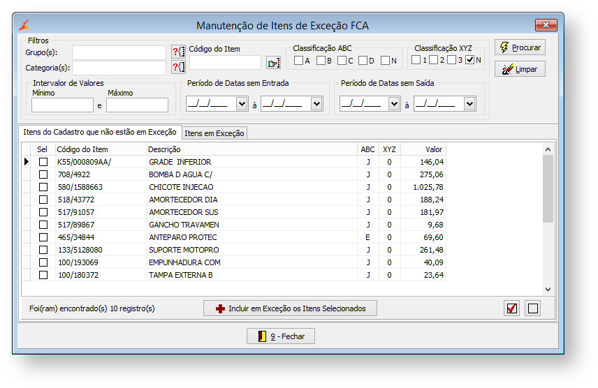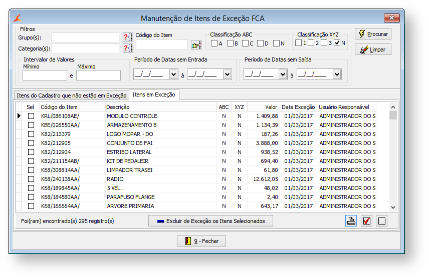A aba "Itens em Exceção" apresenta os itens que já estão cadastrados para o filtro informado.