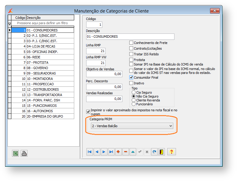Preencher o campo "Categoria PRIM", conforme as opções existentes. É possível informar a mesma categoria PRIM para mais de uma categoria do Linx DMS.