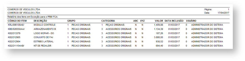 A informação de que um determinado item está em exceção será utilizada na geração do registro de estoque do arquivo PRIM2. As informações referentes ao item em estoque serão enviadas no arquivo, porém o item será marcado para não ter a quantidade controlada pela FCA.