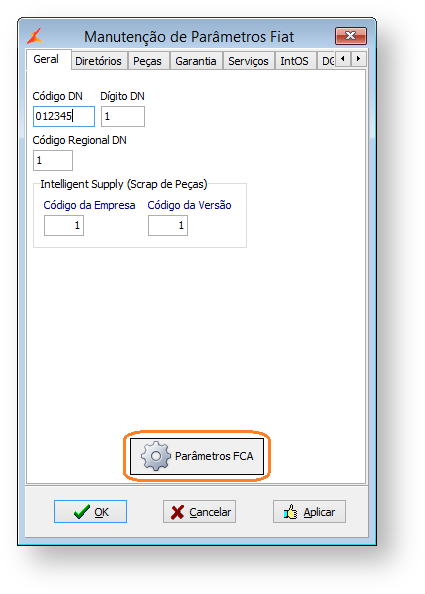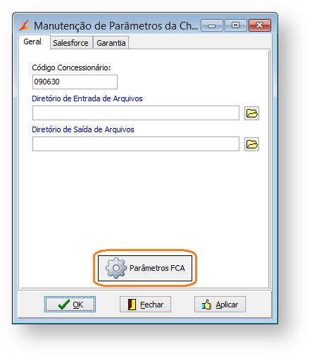 O botão "Parâmetros FCA", existente na aba "Geral", permite que sejam acessados os parâmetros específicos da FCA.