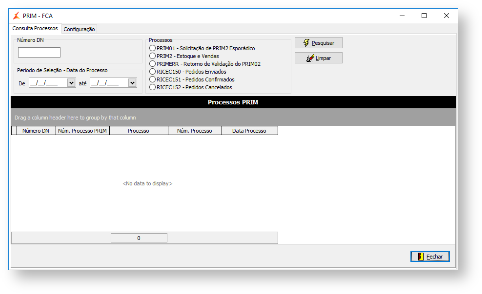 Para isso, acesse o menu "Configuração > PRIM FCA", aba "Consulta Processos".