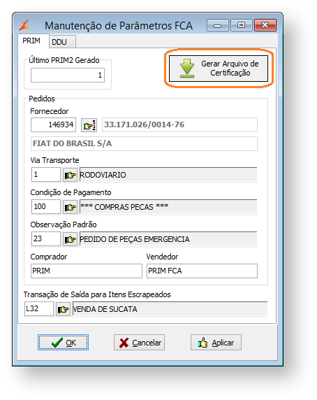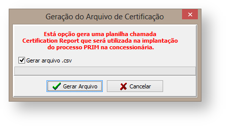 O arquivo de certificação é gerado na implantação do processo PRIM na concessionária a pedido da montadora. A geração deve ser realizada após a configuração estar concluída.