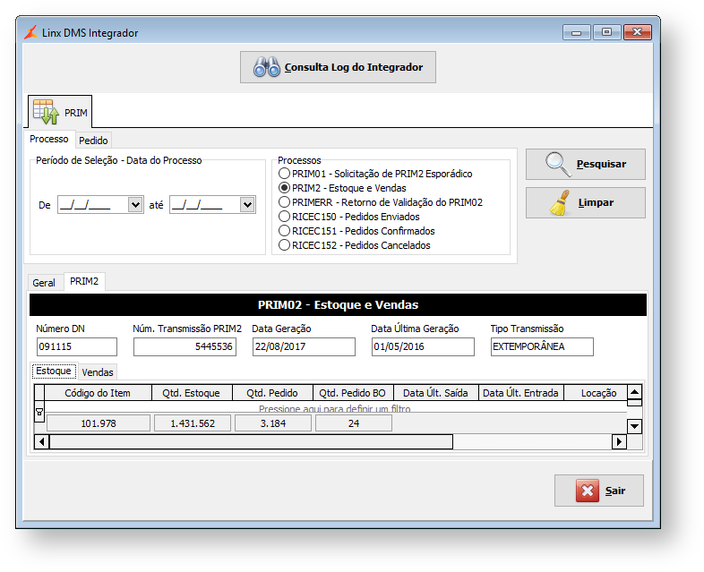 FCA para o DMS | PRIM01 | Pedido específico de dados de estoque e movimentações. |