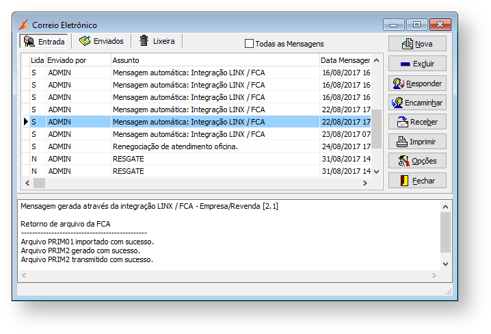 Conforme a comunicação é realizada, o Linx DMS Integrador envia mensagens para o correio interno informando o andamento da execução. A mensagem será enviada para o usuário informado no parâmetro "Notificar usuário caso ocorra erro" do cadastro de Empresas e Revendas, aba Agenda de Processos.