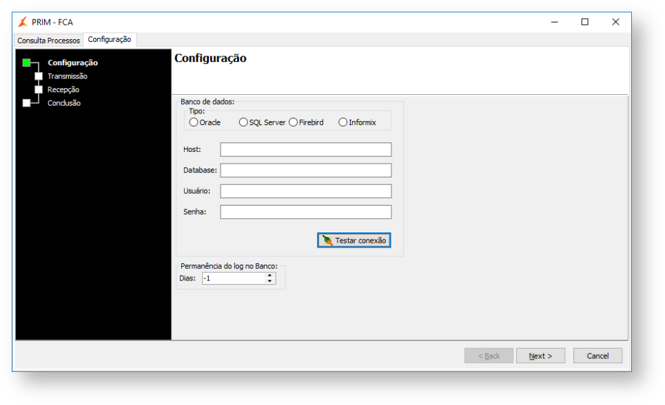 - Na aba "Configuração", preencha os dados de acesso ao banco de dados;