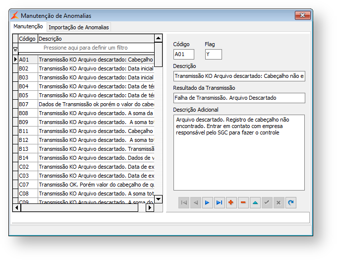 O código da Anomalia é retornado no arquivo PRIMERR, referente ao arquivo PRIM2 enviado. O arquivo PRIMERR fornece uma descrição básica da anomalia. O cadastro de anomalias fornece uma descrição detalhada.
