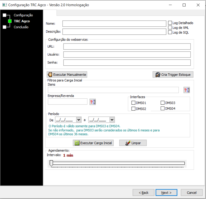 - Executado ao clicar no botão “Carga Inicial”, na tela de configuração da Integração do TRC AGCO;
