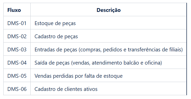 - DMS-04: Vendas, atendimento balcão e oficina, registradas ou alteradas no período estabelecido;