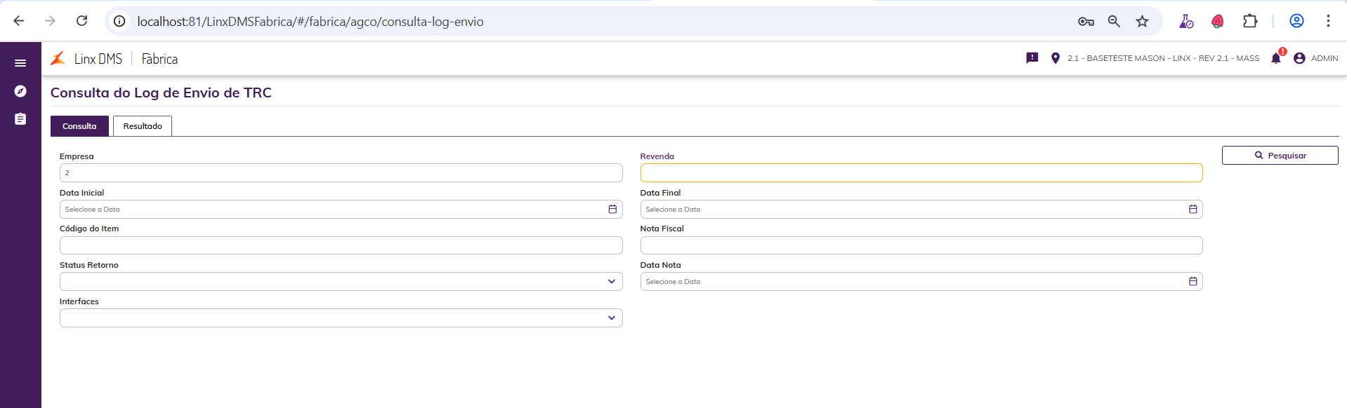 Acesse o Menu Fabrica - AGCO - TRC - Pesquisa Log TRC