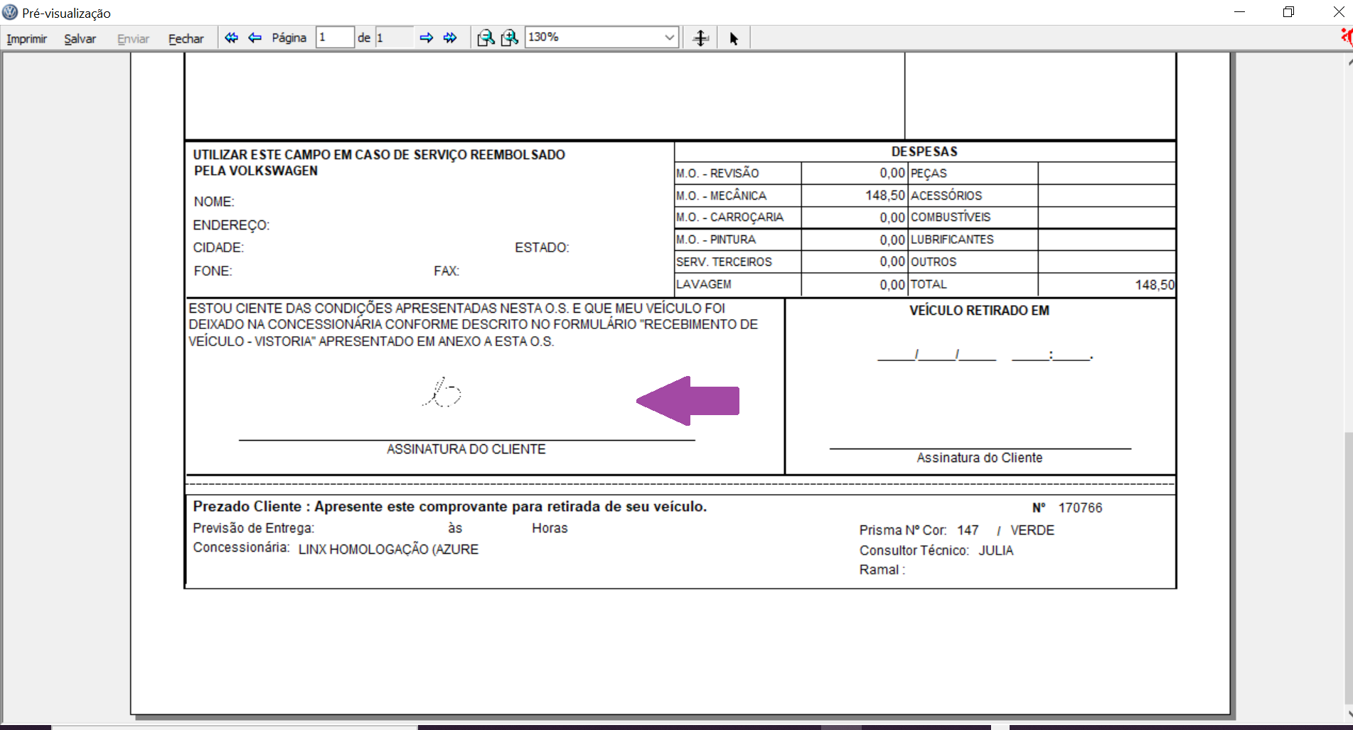 Na reimpressão da O.S. podemos visualizar a assinatura do cliente.