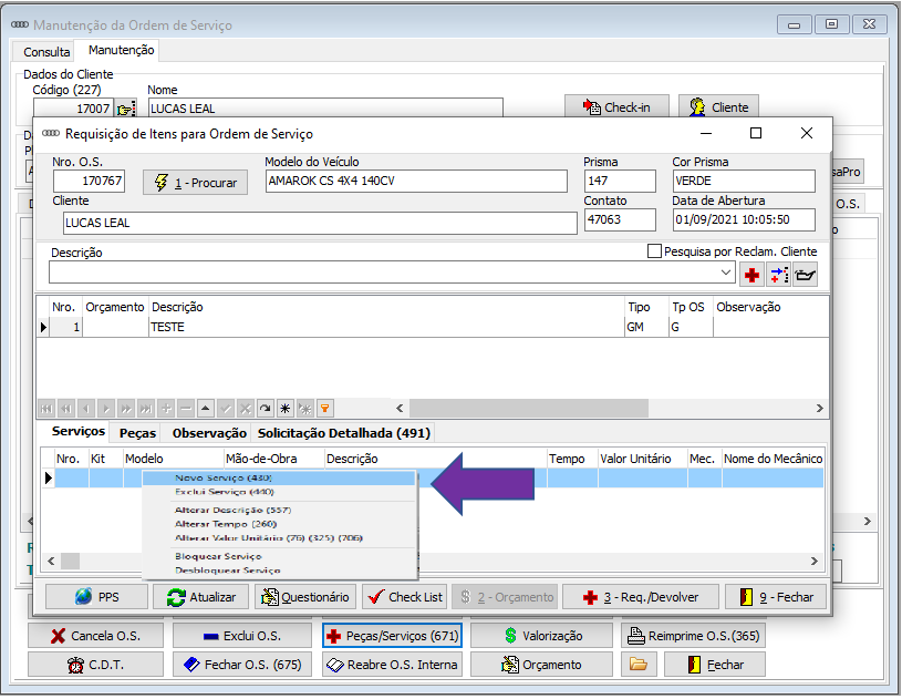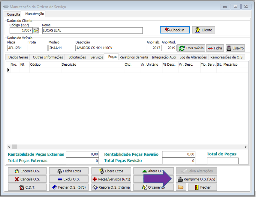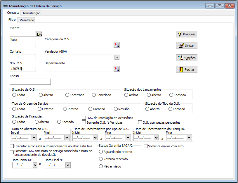Após finalizar a geração do Check-in e da O.S., acesse o menu ""Oficina > Ordem de Serviço > Manutenção" e pesquise pela O.S. gerada através do Check-in.