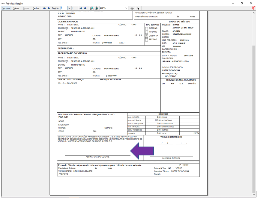 Ao adicionar um serviço ou peça alterando o valor da O.S., podemos verificar que na reimpressão não é possível visualizar a assinatura anterior.
