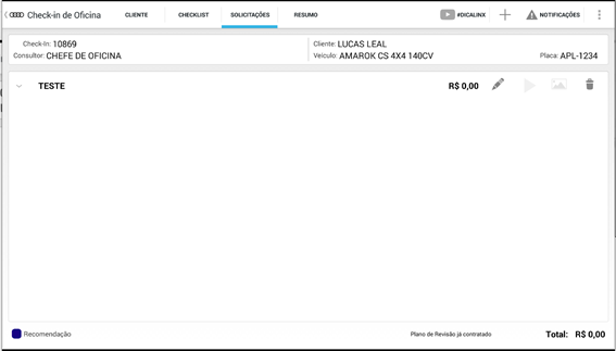 Neste exemplo, vamos utilizar uma solicitação sem valores de peças ou serviços.
