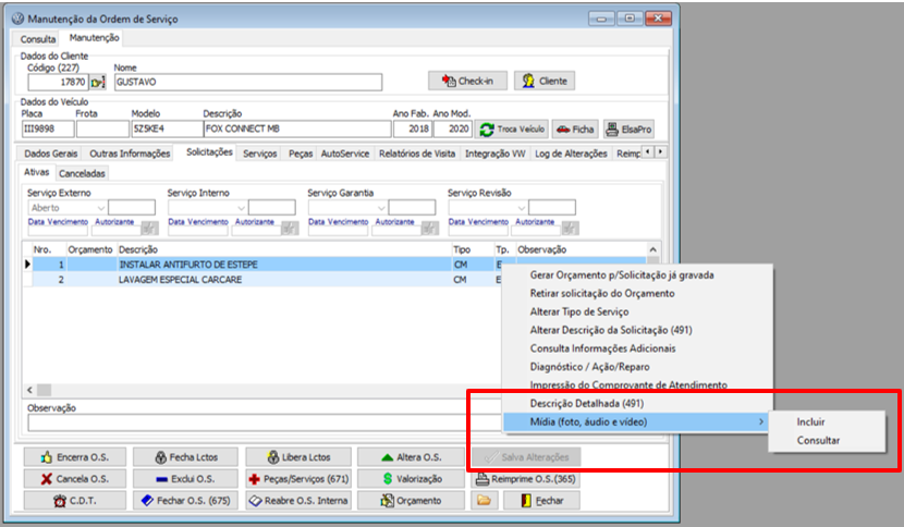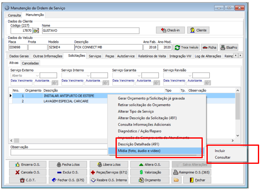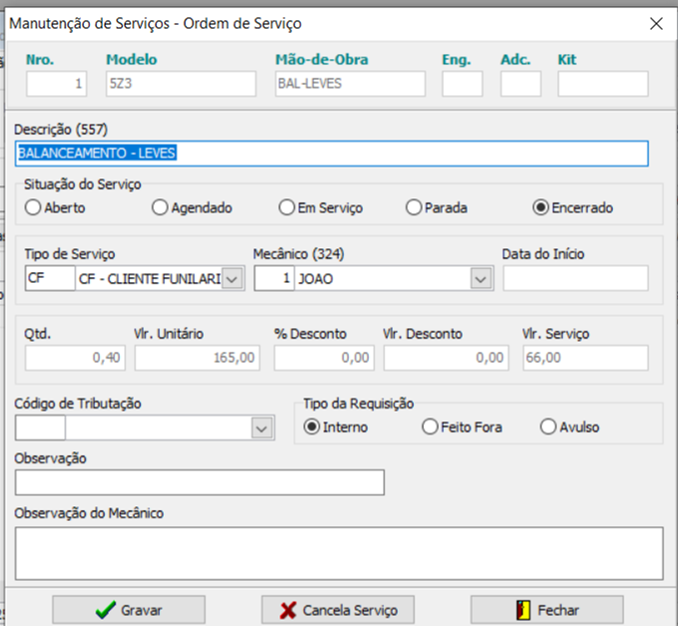 Menu: Fluxo de Oficina > Execução do Serviço > Ordem de Serviço (70780) > Manutenção.