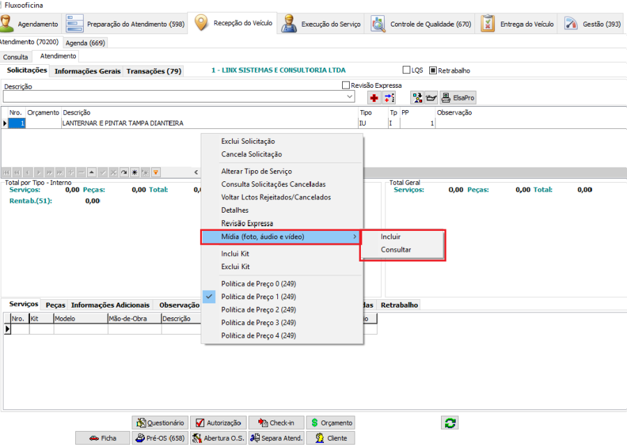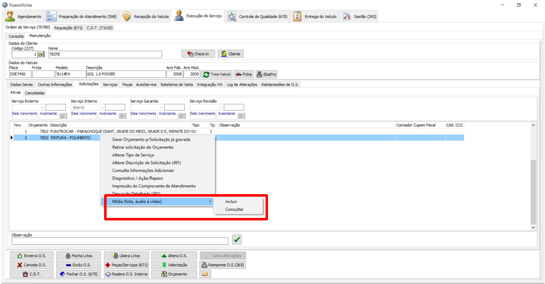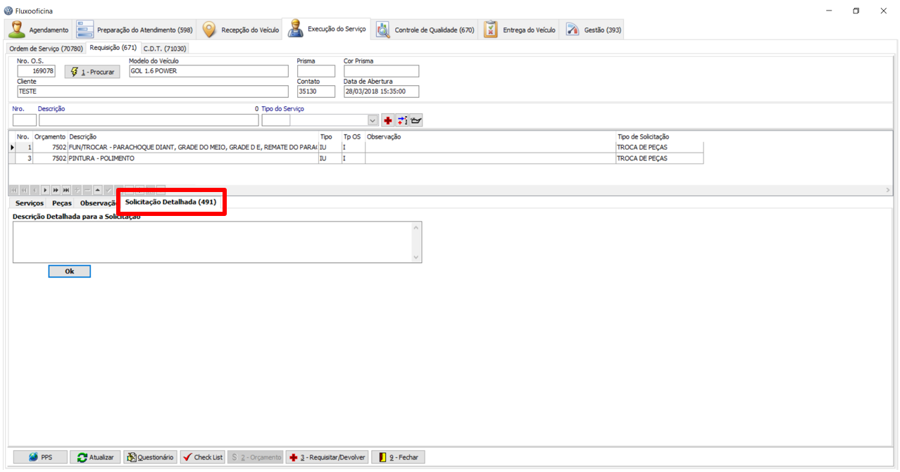 Menu: Fluxo de Oficina > Execução do Serviço > Requisição (671).