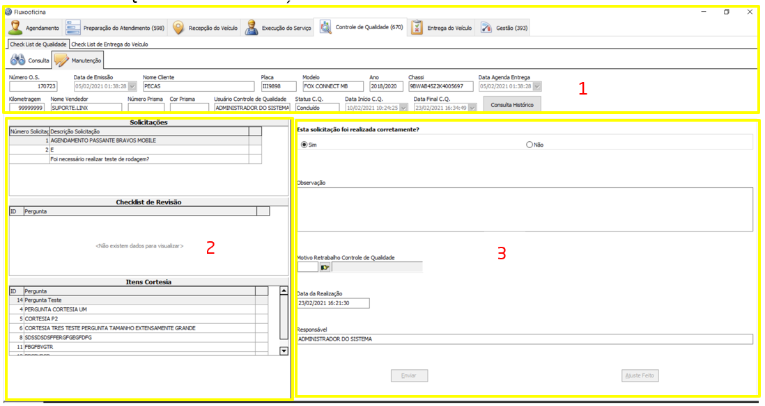 • Quadro 2: Todas as solicitações da O.S. mais um item de Teste de Rodagem e as perguntas cadastradas para o Checklist (Menu: Bravos > Oficina > Parâmetros > Módulo > Aba Geral > Sub Aba Configurações- Controle de qualidade VW)