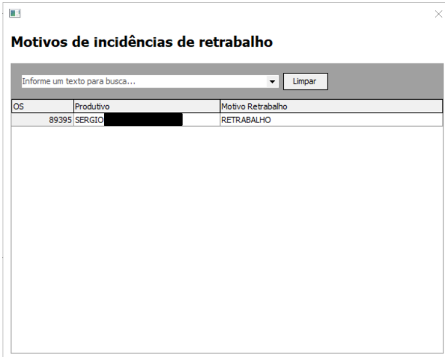 Ao dar duplo clique no gráfico Motivo de Incidências de Retrabalho, é apresentada a tela de listagem.