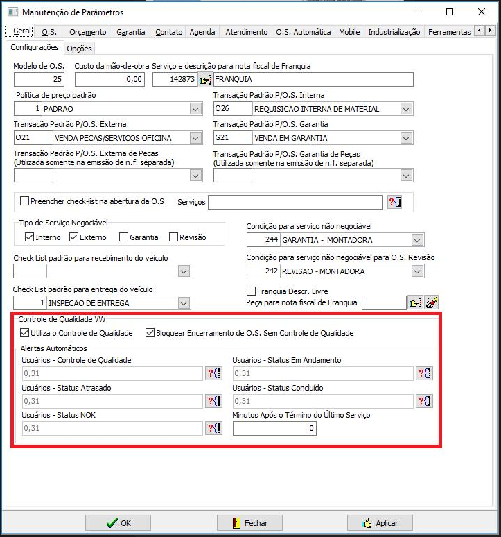 • Bloquear Encerramento de O.S. Sem Controle de Qualidade: Opção para obrigar que o processo de Controle de Qualidade esteja todo preenchido e encerrado para que a O.S possa ser encerrada.