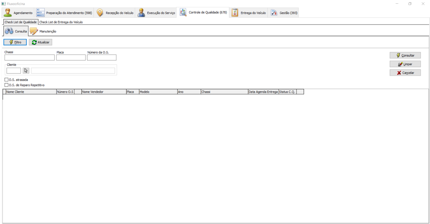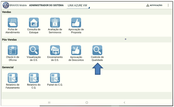 VW: Menu: Fluxo de Oficina> Gestão > Controle de Qualidade.