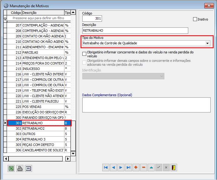 • Grade de manutenção do Checklist VW: Grade para inserir/alterar/excluir registro do Checklist VW que não vieram da sincronização com a montadora.