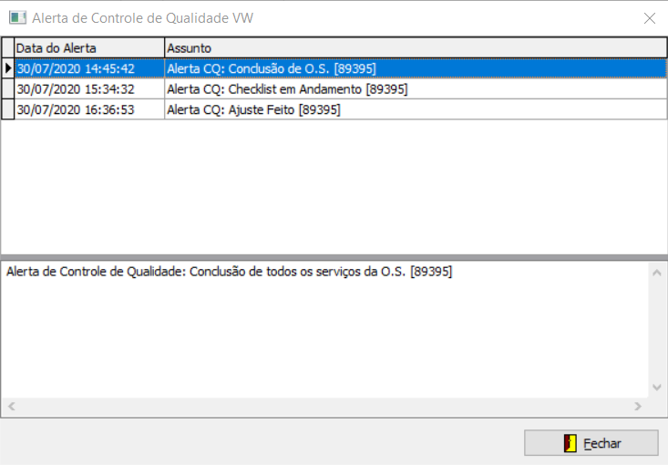 Tela com as mensagens de alertas gerados no processo do Controle de Qualidade.