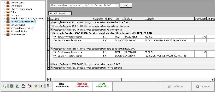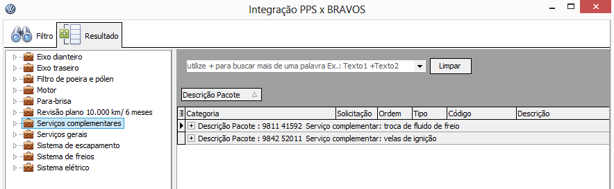 Para a categoria de <Serviços complementares>, serão exibidos somente os pacotes que atendam uma determinada regra, definida pela VW/Audi, com base no modelo (model code), KM e tempo (o que ocorrer primeiro), de acordo com o plano de serviço. Conforme demonstrado na tela que segue: