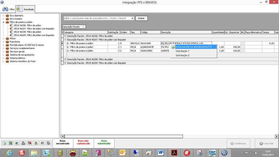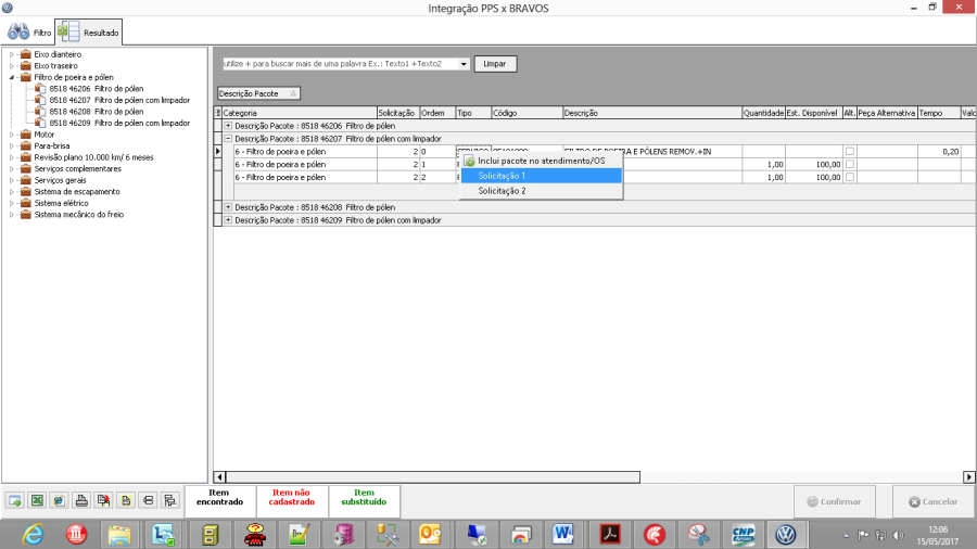 No PPSo, é preciso expandir a composição do pacote no botão "+". Posicione o botão do mouse sobre a linha do serviço e clique com o botão direito do mouse para abrir o menu de solicitações. Feito isso, selecione a solicitação onde deseja incluir o serviço. Nas telas abaixo, alteramos a solicitação do serviço de 2 para 1. Repare que todos as peças/serviços já vieram associados a solicitação 2 (Componentes da Revisão), pois foi essa a solicitação que selecionamos antes de clicar no botão PPS. Então, só é necessário alterar as solicitações dos itens que devam ser incluídos em outra solicitação, que não é a selecionada antes de clicar no botão PPS.