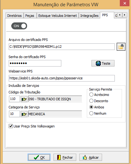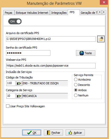No campo "Webservice PPS" deve ser informado https://gw-samb-prod.skoda-api.com/aftersales/pps-online-ppsoservice/v1?Subscription-Key=4fc6ab0cb675460e8b08eeb6a406c964. Os dados de certificado e senha são os mesmos obtidos no início deste processo de configuração. Os demais parâmetros são utilizados no processo de cadastro de serviços/mão-de-obra do PPSo (caso algum serviço retornado pelo PPSo não estiver cadastrado no sistema, ele será cadastrado automaticamente utilizando estes parâmetros).