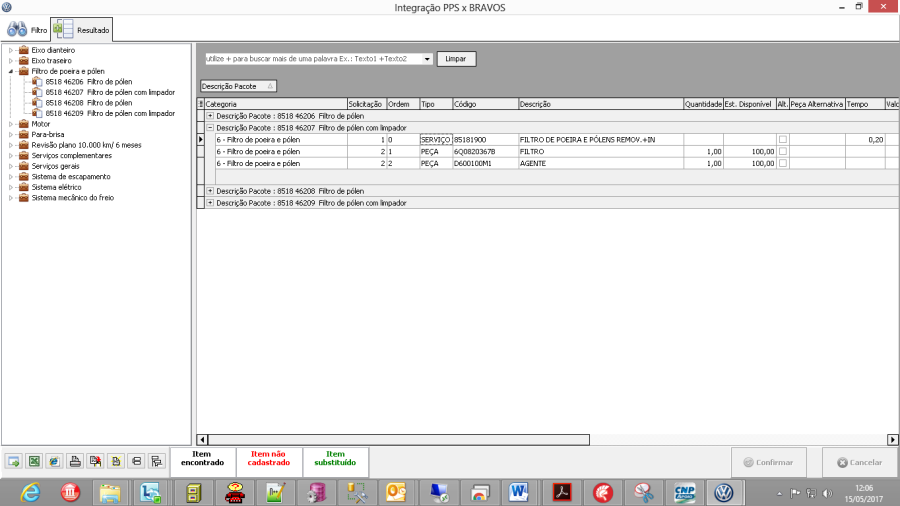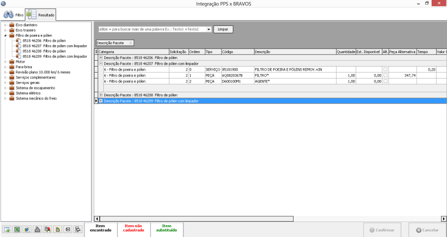 • Os itens em vermelho indicam que esta peça ou o óleo não estão previamente cadastrados na base do sistema. Informe o responsável por Peças para fazer o acerto da base. Os demais serviços serão cadastrados automaticamente na base.