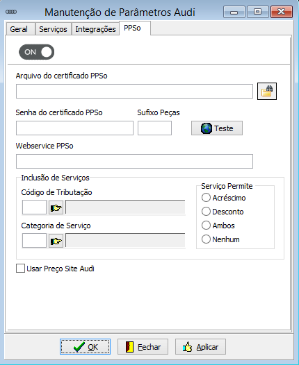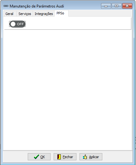 Para habilitar o uso, é necessário acessar o menu "Fábrica> Audi> Parâmetros" e, na aba "PPSo", clicar no botão OFF: