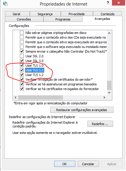 Para utilizar a integração com o PPSo, é necessário habilitar o "TLS 1.2". Para isso, é necessário entrar nas propriedades da internet: