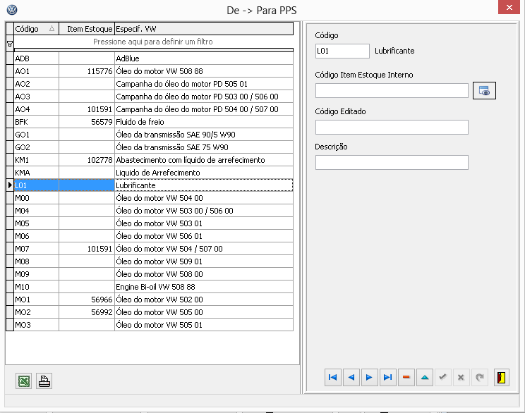 • Óleos: Cadastro De>Para de óleos. Este relacionamento deve ser feito manualmente pela revenda, após a carga de catálogos realizada pelo botão "Atualiza Catálogos":