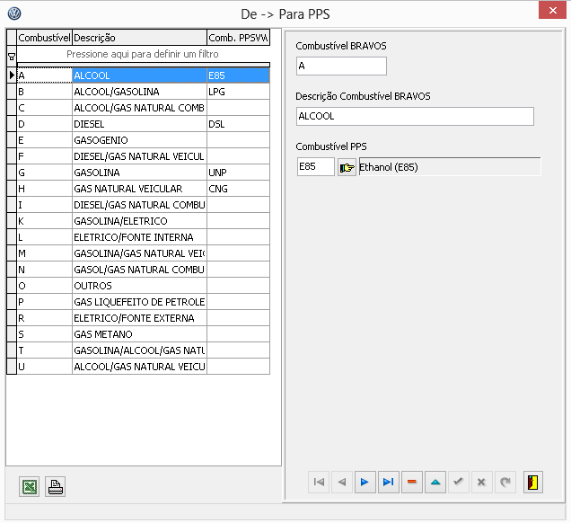 • Combustíveis: Cadastro De>Para de combustíveis. Este relacionamento deve ser feito manualmente pela revenda, após a carga de catálogos realizada pelo botão "Atualiza Catálogos":