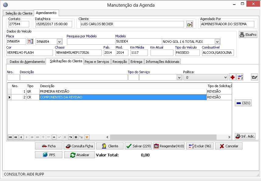 Informe neste campo a Km Atual do veículo, para que os serviços complementares sejam exibidos corretamente. Na tela em que aparecer todos os pacotes do PPSo, é necessário associar a M.O. a classificação do item solicitado (ex: primeira revisão). Não é necessário associar as peças, conforme a tela e a explicação abaixo.