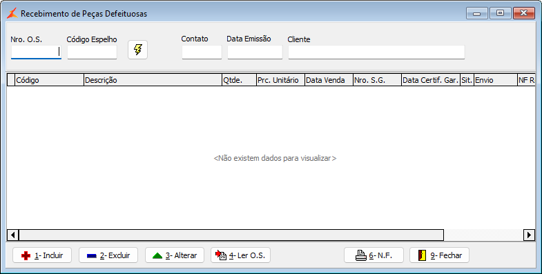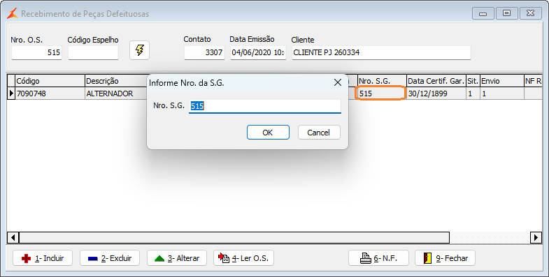 Neste momento serão lidos todos os itens da O.S. para recebimento. Por padrão o campo "Nro. SG" é gravado com o próprio número da O.S., mas é obrigatório que o número da SG real seja informado em cada item a ser devolvido para a fábrica. Esta informação é necessária para o programa de geração da Nota Fiscal de Transporte (item 8) conseguir efetuar as atualizações necessárias no processo.